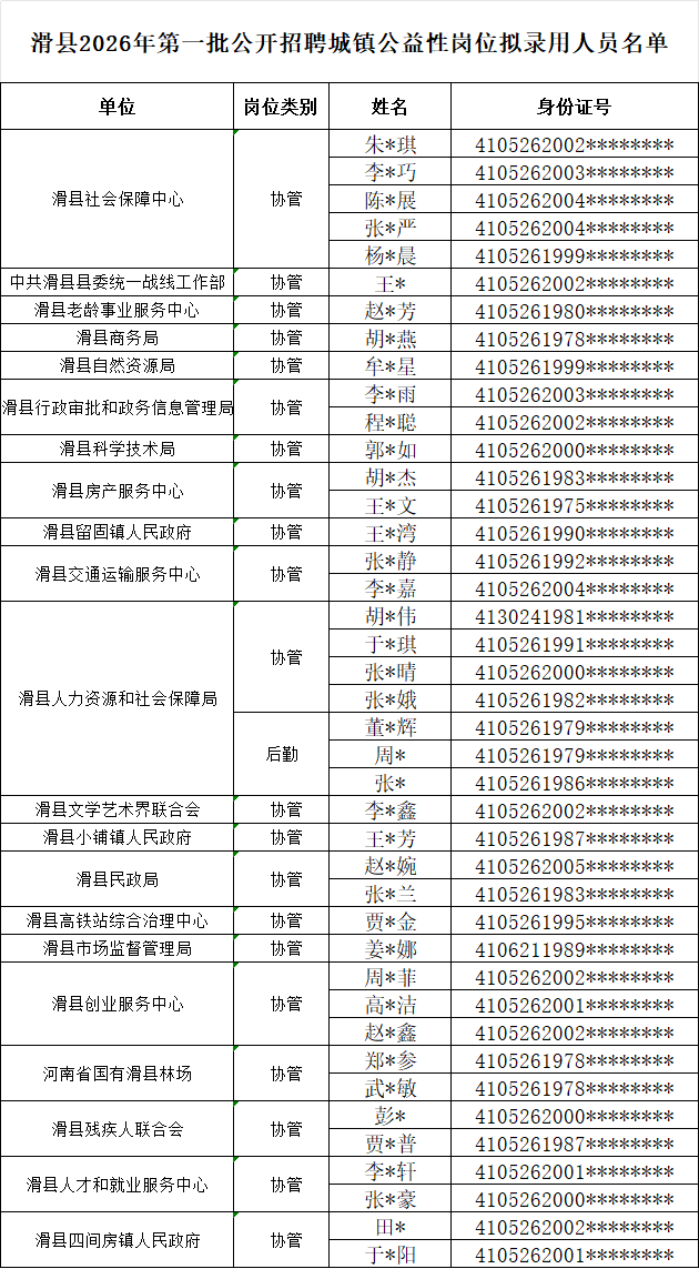 根据《滑县2026年第一批公开招聘城镇公益性岗位安置就业困难人员的通告》规定,经组织报名、资格审查、双向选择等程序,现将拟聘用人员名单予以公示。